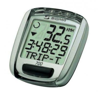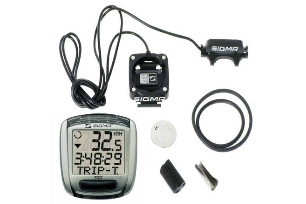 Велокомпьютер проводной Sigma BC 700, арт. sig-8910. В комплект входит: литиевая батарея CR 2032 3V, крепеж на руль с датчиком на вилку, магнит на спицу, 2 резинки для крепления велокомпьютера.